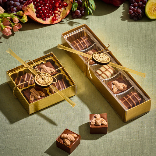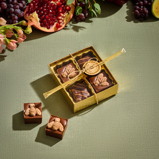 Elegant gift boxes filled with 4 handcrafted gourmet chocolate truffles, featuring honey-inspired designs perfect for Rosh Hashanah. Each premium ...