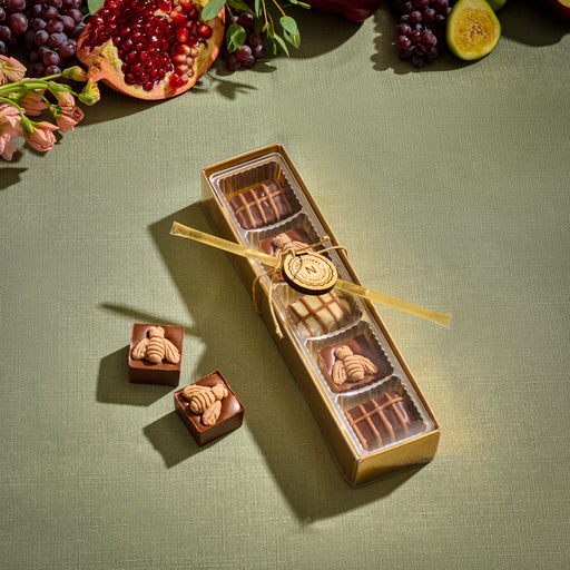 Elegant gift boxes filled with 5 handcrafted gourmet chocolate truffles, featuring honey-inspired designs perfect for Rosh Hashanah. Each premium t...