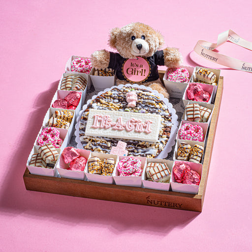 Celebrate the arrival of a baby girl with The Nuttery’s Baby Girl Pie and Chocolates Gift Tray in Party Cups with Bear. This charming gift tray fea...