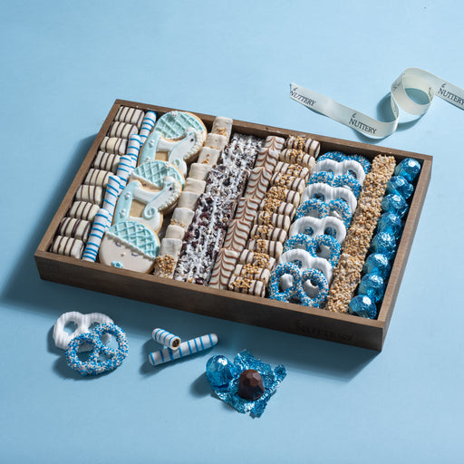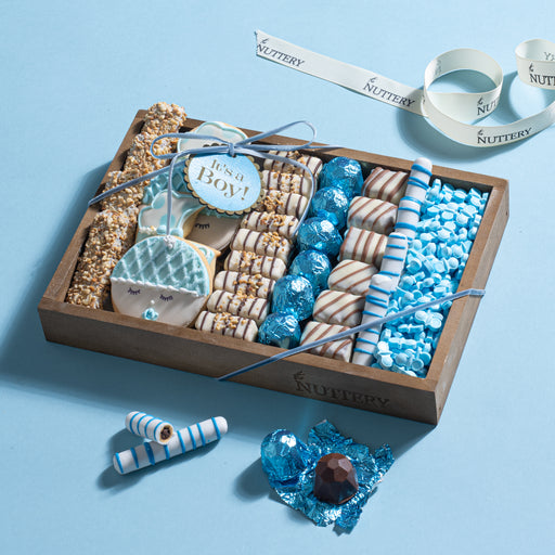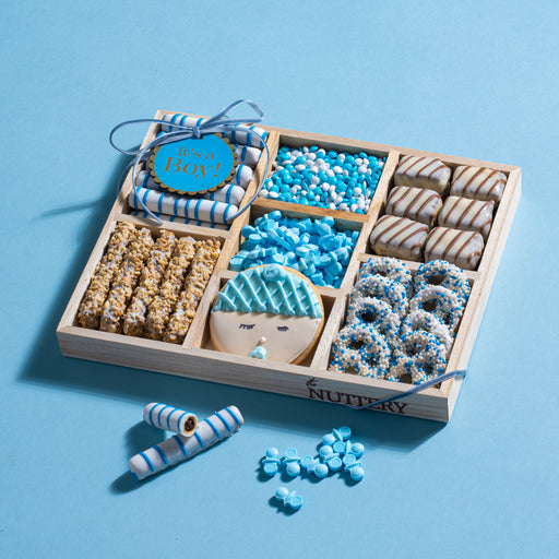 Celebrate the arrival of a baby boy with this beautifully crafted gift tray from The Nuttery. The wooden platter is divided into seven sections, ea...
