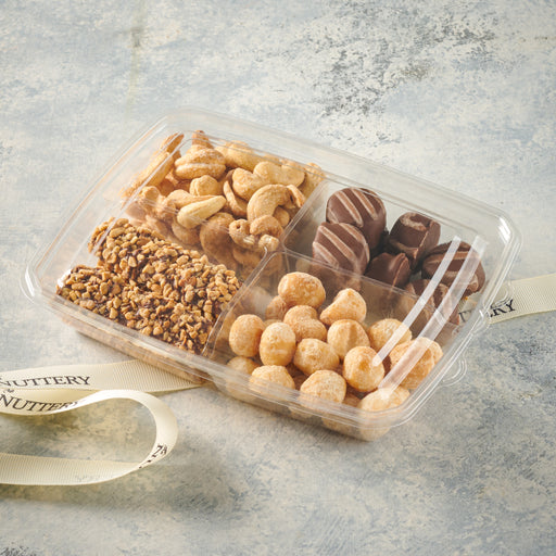 Kosher L'Pesach Chocolate and Nut Mix.Signature Nuttery Gift Tray filled with Kosher for Passover Chocolates and Nuts.Tray Dimensions: 8" x 8"Conta...