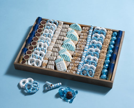 Not sure which gift to give? This chocolate and candy arrangement is the perfect way to proclaim “It’s a Boy!” This square wooden tray displays blu...