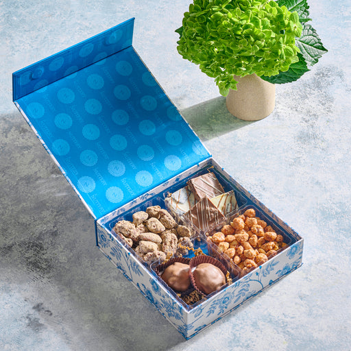 Celebrate Purim with a refined Dairy Mishloach Manos, presented in our striking blue floral gift box. Featuring an elegant botanical design with ri...
