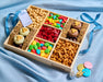 Featuring crunchy cashews, sweet peanuts, colorful candy varieties, chewy licorice bites, and our signature Chanukah-themed chocolate treats, each section offers something irresistible. Thoughtfully arranged in a sleek wooden tray and finished with a “Happy Chanukah” tag, it makes an impressive and memorable gift for family, friends, coworkers, or hosts.