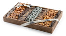 The Nuttery’s Chocolate Pretzel and Nut Gift Tray is an exquisite collection of handcrafted chocolates, beautifully arranged in a wooden tray. The elegant presentation is enhanced by The Nuttery’s signature ribbon and decorative wooden serving sticks, making it perfect for gifting or serving at special occasions.